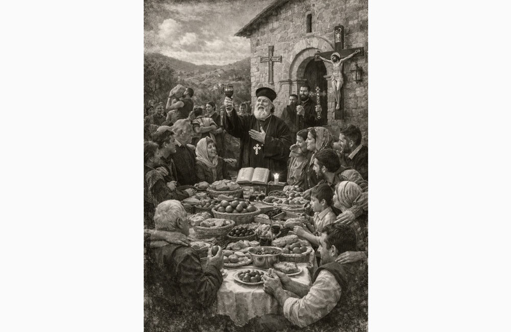 Στο τέλος ο ιερέας διάβαζε την ευχή των καλαθιών, ειδική ευχή με την οποία ευλογούσε το περιεχόμενό τους. Στη συνέχεια κάθονταν όλοι σε κοινό τραπέζι, που ετοιμαζόταν στην αυλή της εκκλησίας. Πριν από το φαγητό ο ιερέας που καθόταν σε προνομιούχα θέση, έψαλλε το «Χριστός Ανέστη» και ακολούθως οι ψάλτες με τους παρευρισκομένους συνέχιζαν με άλλα αναστάσιμα τροπάρια. Τη γιορταστική ατμόσφαιρα συμπλήρωναν διάφορα αγωνίσματα, όπως ή ανύψωση κάποιας βαριάς πέτρας (διτζ'ίμιν), στα οποία συμμετείχαν οι νέοι που επεδείκνυαν έτσι την παλικαριά και τη δύναμή τους.