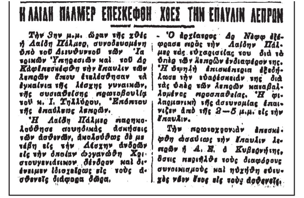 Τον Αύγουστο του 1909, ο Αμερικανός γιατρός Κάλβιν ΜακΚάρολ επισκέφθηκε την αποικία των λεπρών μαζί με μερικούς άλλους Αμερικανούς ιεραποστόλους. Περιέγραψε την επίσκεψή του σε μια επιστολή που δημοσιεύθηκε σε εκκλησιαστικό περιοδικό με την ονομασία Olive Tree.