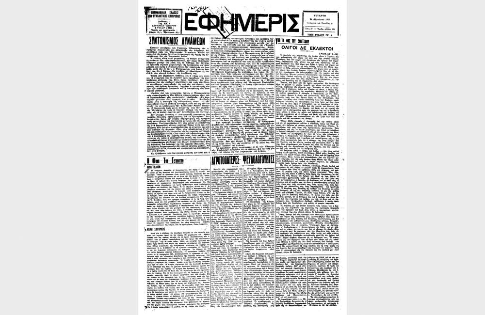 Σε κύριο άρθρο στην πρώτη έκδοση της εφημερίδας με τίτλο Οἱ Σκοποί μας αναφέρονται και τα ακόλουθα: Πρωταρχικός σκοπός μας εἶναι νά συνεισφέρωμεν ὃ,τι δυνάμεθα διά τήν ἀνοικοδόμησιν τοῦ χριστιανικοῦ πολιτισμοῦ. Φανερά ἡ ἀγωνία τῆς ἀνθρωπότητας μετά τόν ὂλεθρον τοῦ πολέμου. Φανερά ἐπίσης ἡ ἀνεπάρκεια τοῦ μηχανικοῦ πολιτισμοῦ. Ὁλοφάνερον τό ἠθικόν ξεχαρβάλωμα πού κατέκλυσε τόν κόσμον, ἂτομα καί λαούς. Μία ἡ σωτηρία: ὁ ἀληθής Χριστιανισμός. Εἵς ὁ δρόμος: ἐκεῖνος πού ἐχάραξεν ὁ Ἱησοῦς. Αἱ ἐπιταγαί τῆς θρησκείας πρέπει νά γίνουν πίστις καί συνείδησίς μας... Ἡ «Ἐφημερίς» θά κάμῃ τό πᾶν, διά νά ζωντανέψῃ τήν πίστιν μας καί νά τήν μεταβάλῃ εἰς ἒργα. Ἡ Ἑλλάς πρέπει νά γεμίσει τήν καρδίαν ὃλων μας...