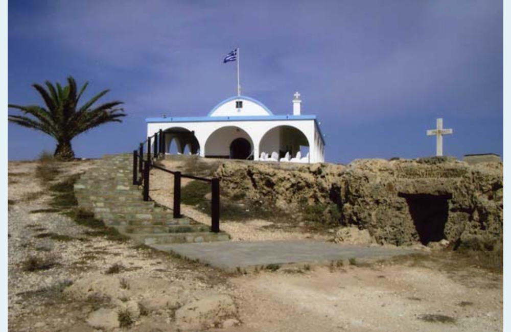 Τέσσερα περίπου χιλιόμετρα νοτίως του χωριού Σωτήρα, είναι κτισμένο νεότερο ξωκλήσι αφιερωμένο στην αγία Θέκλα. Το ξωκλήσι αυτό, που δεσπόζει στην ακτή, είναι κτισμένο στα ερείπια μιας παλαιοχριστιανικής βασιλικής, πιθανότατα του 6ου αιώνα μ.Χ. Μεγάλο τμήμα του νότιου τοίχου της βασιλικής αυτής διακρίνεται στην επιφάνεια του εδάφους, νοτίως του ξωκλησιού. Άλλοι τοίχοι εγκάρσιοι προς τον τοίχο αυτό διακρίνονται νοτιότερα. Δέκα περίπου μέτρα νοτιοδυτικά του ξωκλησιού υπάρχει λαξευμένος στον πωρόλιθο, στην ανατολική πλευρά μικρού κόλπου, μακρόστενος τάφος, μήκους 7,40 μ. στον οποίο κατεβαίνει ο επισκέπτης από χαμηλή είσοδο. Ο τάφος αυτός αποτελείται από στενό διάδρομο πλάτους 0,90 μ. και μήκους 7,40 μ. με κατεύθυνση από δυσμάς προς ανατολάς, σε κάθε πλευρά του οποίου ανοίγονται τρία αρκοσόλια μήκους 1,70 μ. και πλάτους 0,90 μ. το κάθε ένα. Μεταξύ των αρκοσολίων κάθε πλευράς υπάρχει παραστάς πλάτους 0,50 μ. περίπου. Ο διάδρομος συνεχίζεται περί το 1,30 μ. πέραν των δυο ανατολικών αρκοσολίων και σχηματίζει ένα είδος ορθογώνιας θήκης. Το χαμηλό τοίχωμα των αρκοσολίων προς την πλευρά του διαδρόμου έχει αφαιρεθεί όταν ο τάφος αυτός μετετράπη σε εκκλησία της Αγίας Θέκλας. Πότε έγινε αυτό δεν είναι γνωστό. Ούτε είναι δυνατό να χρονολογηθεί ακριβώς ο τάφος αυτός. Πιθανότατα όμως ο τάφος λαξεύθηκε στους τελευταίους Ρωμαϊκούς χρόνους.