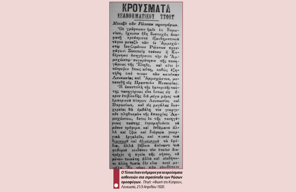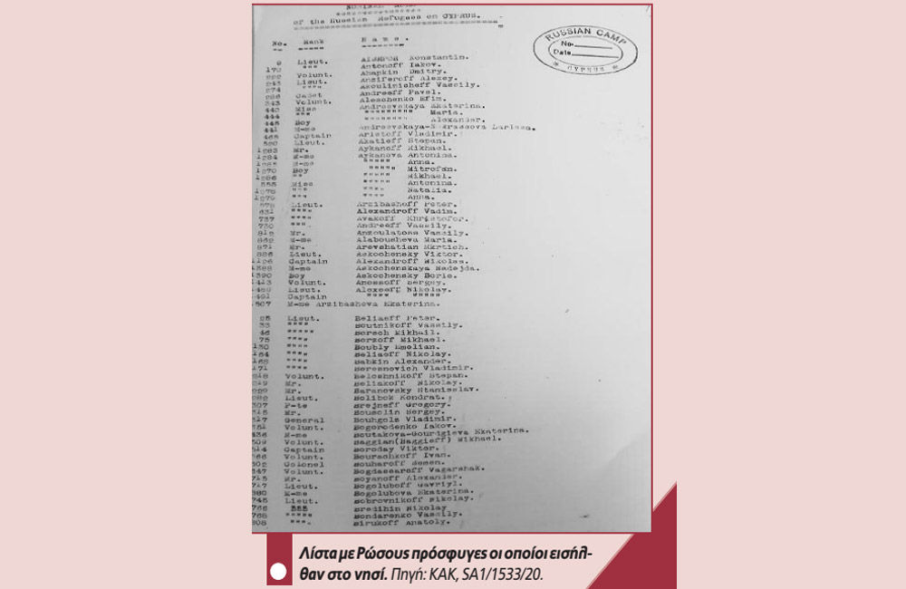 Ρώσοι αντικαθεστωτικοί πρόσφυγες οι οποίοι κατά τη διάρκεια του εμφυλίου πολέμου στη Ρωσία μεταξύ Κομουνιστών και υποστηρικτών του Τσάρου, έφτασαν στγην Κύπρο. Υπολογίζεται ότι από το στρατόπεδο αυτό κατά την περίοδο 1920-21 πέρασαν γύρω στις 6000 άτομα.