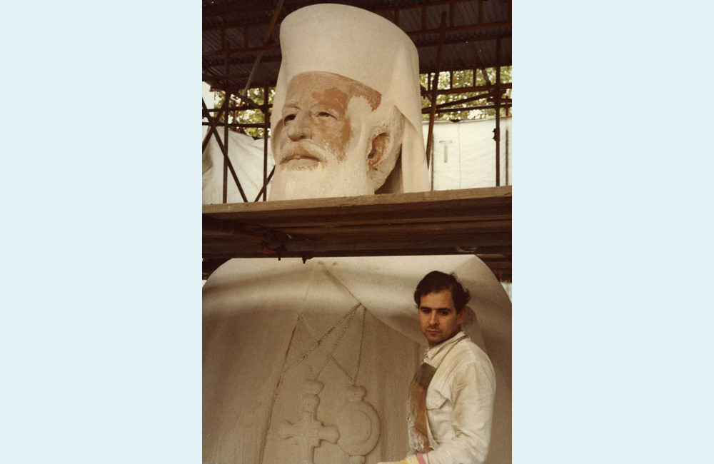 Στην Κύπρο είναι γνωστός κυρίως από ανδριάντες του αρχιεπισκόπου Μακαρίου Γ' που φιλοτέχνησε κατά τα τελευταία χρόνια. Ένας ανδριάντας στήθηκε στον Πεδουλά κι ένας δεύτερος στο Ακάκι. Επίσης άγαλμα του Ντ. Παύλου στήθηκε στη Δορά και στην Πάφο ανδριάντας του Ευαγόρα Παλληκαρίδη. Εργάστηκε στο στούντιό του στο Λονδίνο, φιλοτεχνώντας τεράστιο μπρούντζινο ανδριάντα του εθνάρχη Μακαρίου, ύψους περί τα 10 μ. Το κολοσσιαίο αυτό ορειχάλκινο άγαλμα (ανδριάντας) του αρχιεπισκόπου και προέδρου Μακαρίου Γ', στήθηκε το 1987 στον περίβολο του αρχιεπισκοπικού μεγάρου στη Λευκωσία. Η τεχνική της κατασκευής αυτού του ανδριάντα (λόγω κυρίως του μεγέθους του) απέσπασε τα κολακευτικά σχόλια του αγγλικού Τύπου. Στην Κύπρο όμως ο Τύπος επέκρινε το έργο, θεωρώντας πως οι διαστάσεις του δεν ταίριαζαν με τον χώρο και πως γενικά δεν ήταν απαραίτητο να γίνει τόσο μεγάλο (περί τα 10 μέτρα). Τελικά ο ανδριάντας αφαιρέθηκε το 2008 από τον περίβολο της Αρχιεπισκοπής και μεταφέρθηκε στο Θρονί, στον Κύκκο, όπου και ο τάφος του Εθνάρχη.