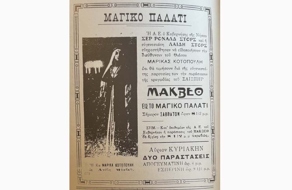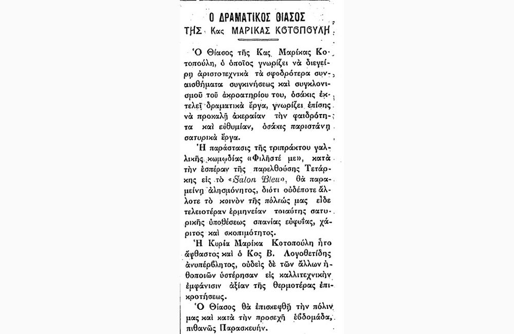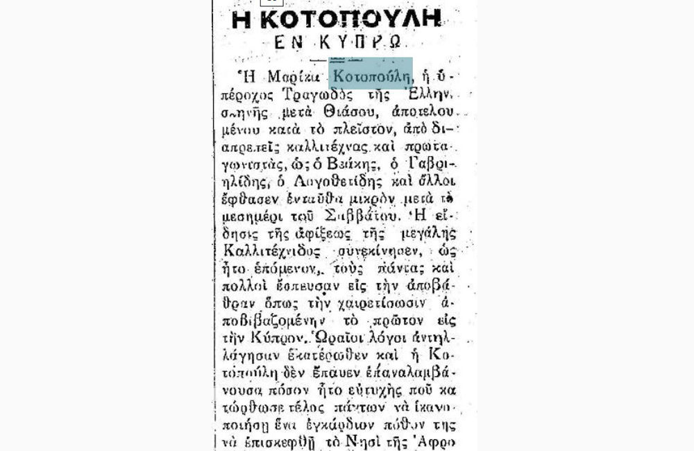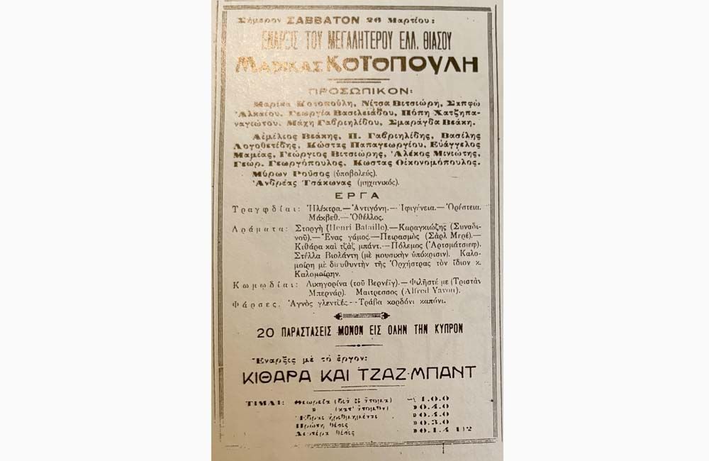 Η Κοτοπούλη με τον θίασο της έδωσε την πρώτη παράσταση στις 25 Μαρτίου του 1927 στη Λεμεσό, γεγονός που καλήφθηκε από τον κυπριακό τύπο. Συγκεκριμένα, η εφημερίδα Αλήθεια ημερομηνίας 25 Μαρτίου 1927 αναφέρει ότι "ο μέγας και φωτεινός αστέρας του θεάτρου, της μεγάλης τέχνης ή θερμουργός ιέρεια του Ελληνικού Πνεύματος, ο κυριώτερος απόστολος ό λεπτότερος ερμηνευτής ευρίσκεται από σήμερον μεταξύ μας και από σήμερον πατεί την Κυπριακήν γήν. Από σήμερον ή Λεμεσός, πρώτη των κυπριακών πόλεων, έστω και τόσον αργά, θα κλίνη ευλαβητικά το γόνυ μπροστά στο μεγαλείον της τέχνης της μοναδικής τραγωδού και θα εγκύψη είς τα φωτεινά μυστήρια τα οποία μέ τόσην αγάπην και αφοσίωσιν Εκείνη παρακολουθεί... Και θα ζωντανέψη η ΜΑΡΙΚΑ ΚΟΤΟΠΟΥΛΗ... εκλεκτόν μεταξύ των εκλεκτών, τας αρχαίας τραγωδίας τας αθανάτους του Σοφοκλέους....". Ο θίασος της Κοτοπούλη παρουσίασε επίσης τον Οθέλλο του Σαίξπηρ, τη Στέλλα Βιολάντη του Γρηγόριου Ξενόπουλου, το δράμα "Στοργή" του Henry Bataille, την κωμωδία "Φιλήστε με" στην οποία πρωταγωνίστησε ο Λογοθετίδης κ.α. Είναι σημαντικό να αναφερθεί ότι η παράσταση Στέλλα Βιολάντη δόθηκε με ζωντανή μουσική υπόκρουση, με διευθυντή της ορχήστρας τον Μανώλη Καλομοίρη (1883-1962).
