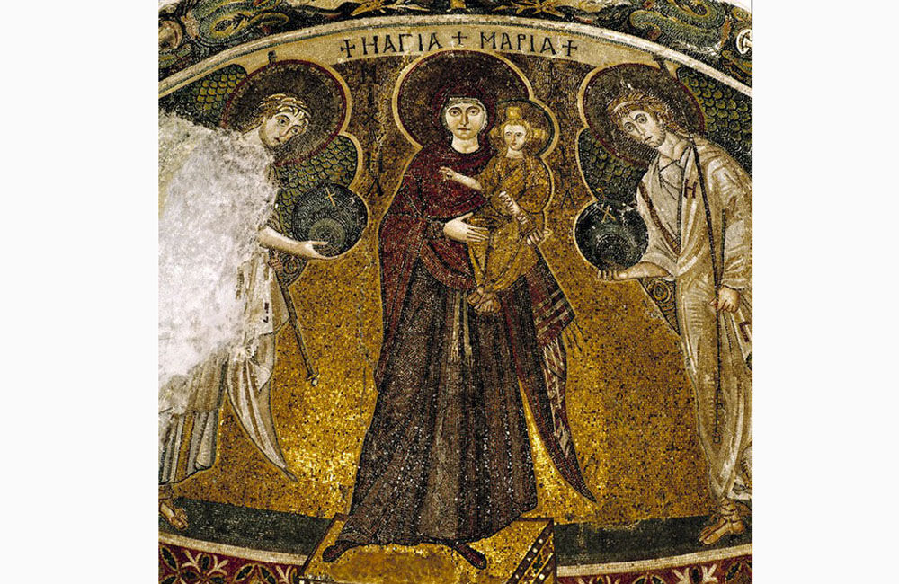 Στο Κίτι το ψηφιδωτό παρουσιάζει την Παναγία όρθια να κρατά το μικρό Χριστό στο αριστερό της χέρι, ενώ την παραστέκουν οι αρχάγγελοι Μιχαήλ και Γαβριήλ. Είναι η αρχαιότερη σωζόμενη μνημειώδης απεικόνιση της Παναγίας Βρεφοκρατούσας. Ο Χριστός, ντυμένος με χρυσά ενδύματα, κρατά στο αριστερό του χέρι κλειστό ειλητάριο ενώ με το δεξί του ευλογεί. Η Παναγία στέκεται σε πολυτελές υποπόδιο, το οποίο διακόπτει τη διακοσμητική ταινία με τα γεωμετρικά σχήματα, δίνοντας έτσι την εντύπωση ότι αυτή κινείται προς τα εμπρός. Αριστερά ως προς την Θεοτόκο εικονίζεται ο αρχάγγελος Γαβριήλ, με πρόσωπο αυστηρό, να κινείται προς αυτήν με ανοικτό και ζωηρό διασκελισμό, υπομιμνήσκοντας με αυτό τον τρόπο το ρόλο του στον Ευαγγελισμό. Στο αριστερό του χέρι κρατεί σκήπτρο και στο δεξιό ένσταυρη σφαίρα, σύμβολο της κυριαρχίας του Χριστού στον κόσμο. Δεξιά ως προς την Παναγία, βρίσκεται ο αρχάγγελος Μιχαήλ, στο μεγαλύτερό του μέρος δυστυχώς κατεστραμμένος, πιο στατικός και ήρεμος, με γαλανά μάτια και καστανόξανθα μαλλιά, που συνθέτουν ένα πρόσωπο εξαιρετικής ομορφιάς. Οι δύο κλασικής ωραιότητας άγγελοι, είναι ντυμένοι με λευκούς χιτώνες φιλοσόφων, ενώ φέρουν εντυπωσιακά φτερά παγωνιού, που συμβολίζουν την αθανασία και την αιωνιότητα.