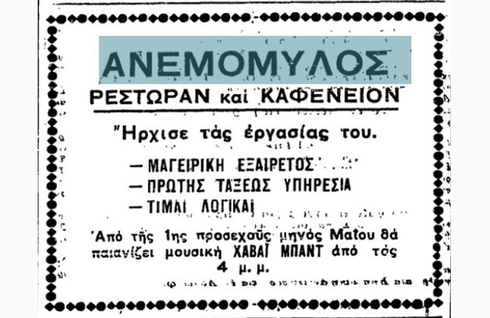 Διαφήμιση για το «Ανεμόμυλος – Ρεστοράν και Καφενείον».