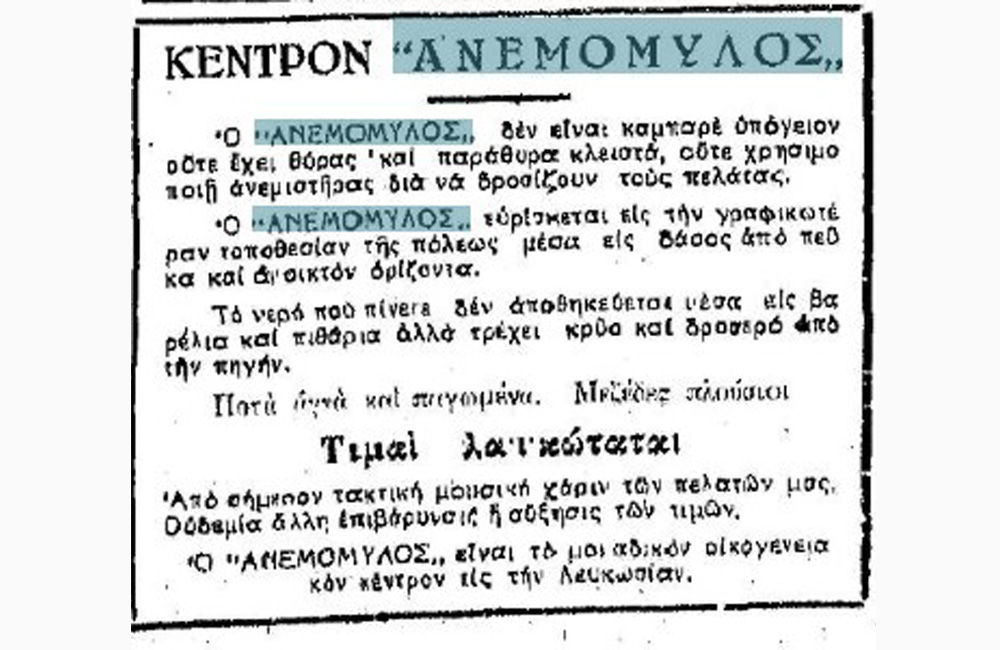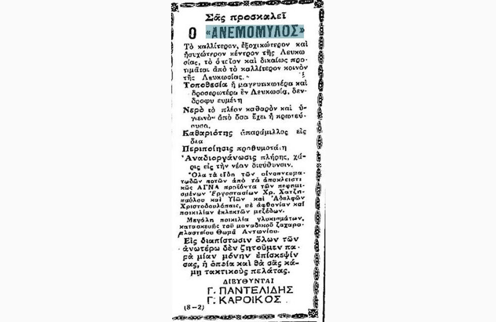 Διαφήμιση παρουσιάζει το κέντρο «Ανεμόμυλος» ως «το καλλίτερον, εξοχικώτερον και μεγαλύτερον κέντρον της Λευκωσίας». Διευθυντές: Γ. Παντελίδης και Γ. Καροίκος.