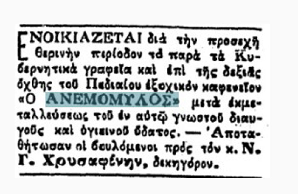 Σε φύλλο της εφημερίδας Ελευθερία εμφανίζεται μία από τις πρώτες γνωστές αναφορές στο τοπωνύμιο «Ανεμόμυλος».