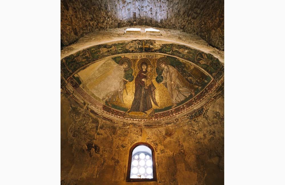 Το ψηφιδωτό παρουσιάζει την Παναγία όρθια πάνω σε καταστόλιστο υποπόδιο να κρατεί τον Χριστό στο αριστερό χέρι, ενώ το δεξί το φέρει προς το γόνατο του Χριστού, σ' ένα προδρομικό τύπο της Παναγίας Οδηγήτριας. Δεξιά και αριστερά από τον Παναγία εικονίζονται οι αρχάγγελοι Μιχαήλ (μισοκατεστραμμένος) και Γαβριήλ. Όλη η σύνθεση περιβάλλεται από μια διακοσμητική ταινία, στην οποία κυριαρχεί το θέμα της πηγής της ζωής μέσα σε πλούσιο βλαστό άκανθα και πτηνά (πάπιες, παπαγάλοι) και ελάφια. Το ψηφιδωτό χρονολογήθηκε σε διάφορες εποχές, από τον 4ο μέχρι τον 14ο αιώνα. Όμως η εικονογραφία και η τεχνοτροπία του ψηφιδωτού αυτού, οδηγούν στην τοποθέτησή του στα τέλη του 6ου αιώνα μ.Χ. Κάτω από το ψηφιδωτό υπάρχουν τοιχογραφίες αρκετά κατεστραμμένες, σε έξι στρώματα. Το τελευταίο στρώμα, με ιεράρχες σε μετωπική στάση, μπορεί να χρονολογηθεί στα τέλη του 11ου ή τις αρχές του 12ου αιώνα.